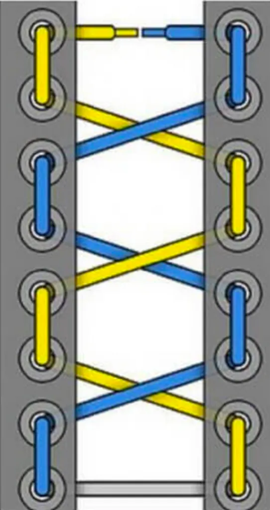 One of the most common and versatile lacing techniques, seen on sneakers by Nike, Tommy Hilfiger, and others.