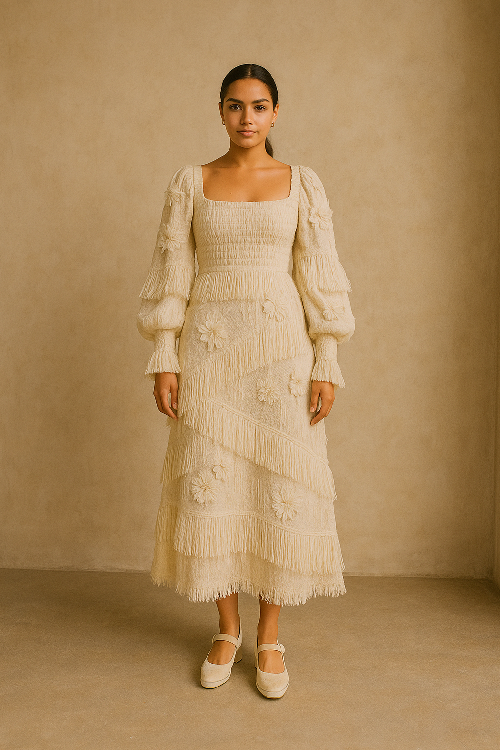 In 2025, fashion is meant to be felt. Literally. Texture is everywhere—fringe, ruching, smocking, quilting, and three-dimensional florals are redefining how clothes move and engage with light. This tactile richness adds visual depth, even to monochrome outfits.